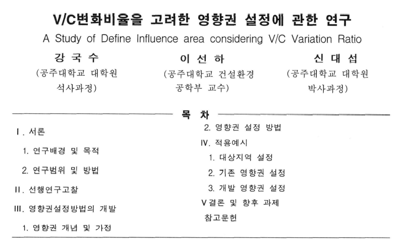 교통영향평가지침에서는 사업이 시행함으로 인하여 주변 교통체계에 미치는 영향의 범위를 설정하는 기준을 제기하고 있다. 이 방법은 획일적인 기준으로 쉽게 영향권을 설정할 수 있으나 사업 대상지의 특성을 반영하지 못하는 단점을 가진다. 또한 반경 몇 km 안의 교차로 볓 개라는 식의 기준은 분석가의 판단에 따라 교차로의 선택이 좌우되는 한계를 가진다. 본 논문에서는 이미 연구된 영향권 설정 방법 및 교통영향평가의 영향권 설정 시준을 분석하고, 링크의 용향을 고려한 교통량 변화율에 의한 영향권 설정 방법을 제시하였더, 이 방법은 분석 범위 내 사업으로 인하여 발생되는 교통량을 기존 교통량과 비교하여 그 차이와 계산된 링크 용량과의 비율을 이용하여 영향권을 설정하는 방법이다. 본 논문에서는 이 방법을 이용하여 새로운 기준을 제시하였다.