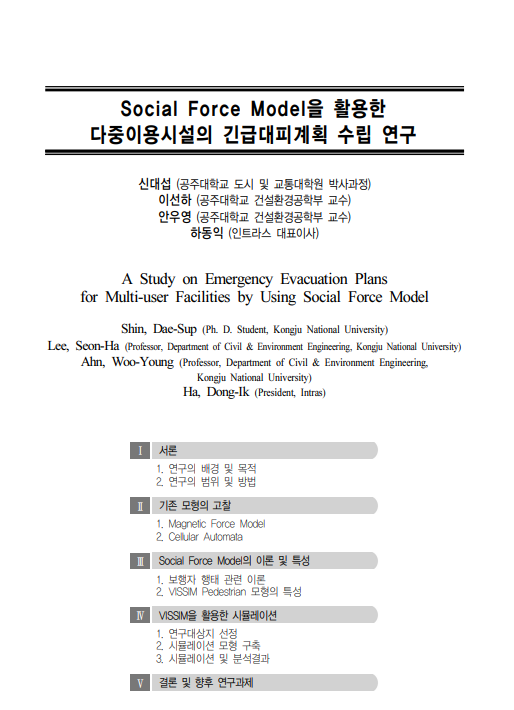 도시의 발전과 함께 건물의 대형화, 복합화 등 다중이용시설이 확대됨에 따라 화재 및 테러 등으로 인한 실내 공간에서의 안전에 대한 관심이 증대되고 있다. 선진 외국에서는 다양한 실험 및 분석을 통하여 건축물의 계획 및 설계단계부터 종합적이고 과학적인 피난 안전설계기준을 법제화하고 있으며, 대피 모델링을 위한 시뮬레이션 프로그램의 개발을 통해 비상상태 발생 시 건축물 피난설계 및 안전성 평가 등에 활용되고 있다. 따라서 본 연구 에서는 화재 발생 시 인명피해를 줄이기 위해 다중이용시설인 Multiplex를 대상으로 VISSIM의 보행자 행태특성 모형인 Social Force Model을 활용하여 비상구를 포함한 출입구의 개수, 폭, 위치 등이 보행자의 대피 속도 및 시 간에 미치는 영향을 분석하고 피난대책 향상방안을 제시하였다. 본 연구결과 출입구의 개수가 2개인 경우 출입구 폭을 1.15~1.35m 그리고 출입구가 3개 이상인 경우 출입구 폭을 0.95m로 설치할 경우 최대대피시간이 100초를 넘지 않고 보행자의 이동거리가 30~50m 이내로 유지됨을 확 인하였다.