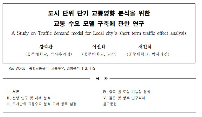 현재 국내에서 교통수요 모형은 국가교통DB를 바탕으로 고 속국도, 국도, 국지도, 지방도 등의 간선 및 보조간선 도로의 수요 예측을 통한 도로 신설 및 확폭의 타당성을 분석하는데 주로 사용되고 있다. 한편으로는 택지개발, 주거단지, 대형시설 등 교통유발시설 이나, 집산도로의 교통영향평가 시 장래 수요 예측에도 사용되 고 있으나 시/군/구 단위의 존(Zone)체계와 연평균 일교통량 (AADT : Annual Average Daily Traffic) 수준의 O/D(Origin and Destination), 간선 및 보조간선급 도로를 바탕으로한 네트 워크를 통해 단지 및 건물 신설이나, 소규모 도로 신설 및 확 장에 따른 교통수요 분석을 수행할 경우 해당 사업의 주요 도 로에 대한 수요분석이 어려우며, 교통영향분석 시 가장 중요한 첨두시간대 교통상황을 정확하게 예측하는 것도 힘들다. 최근 지자체를 중심으로 각종 행사나 공사에 대한 분석이 활발히 이루어지고 있는데 이러한 행사나 공사로 인한 교통 대응 시 정확한 분석을 위해서는 지자체(도시) 단위의 수요 분 석 모형을 구축해야할 필요가 있으며, 이러한 수요 분석 모형 은 ITS를 바탕으로한 정보제공을 통한 통행안정화를 염두에 두는 등 기존 수요모형과 접근 방법과 쓰임에 대한 고려가 달 라야 한다. 이러한 연구는 지방자치 활성화로 인해 많은 수요가 발생하 고 있는 지자체 단위의 교통분석을 활성화하고 정확성을 높이 는 것에도 도움이 될 수 있다. 본 연구에서는 지자체 단위의 교통 수요 모델 구축을 위해 고려해야 할 항목들과 해당 항목의 도입 방안을 제시하려 한다. 이를 위해 2장에서는 교통수요분석의 활용 현황과 교통수요 분석 단위 설정에 관한 선행 연구를 검토하고, 3장에서는 2장 에서 살펴본 교통수요 활용 현황을 바탕으로 지자체단위 교통 수요 분석을 위해 필요한 항목을 도출한다. 4장에서는 항목들 이 수요모형에 적용될 수 있는지를 검토하여 지자체 단위 교 통수요 모형 구축을 위해 고려해야 할 항목을 제시한다.