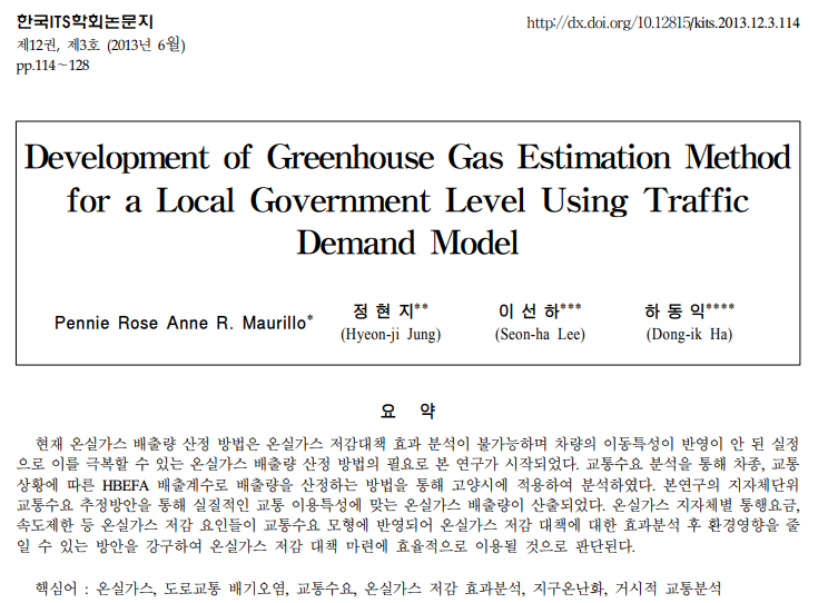 The industrial revolution has brought rapid increase in fossil energy consumption. The transportation sector represents the highest growth in emissions in all sectors which accounts for all significant environmental impacts like climate change (IEA,2012). The United Nations Framework Convention on Climate Change (UNFCCC) in cooperation with different countries has put best efforts to support all necessary undertakings to prevent global warming by reduction of GHGs. Estimation of road traffic emissions and fuel consumption is becoming necessary for the evaluation of environmental policies. Korea’s rapid economic growth for the past decades have ensued growing pressure on the environment due to increased energy consumption. The country’s living standards and extremely fast expansion have made it one of the most rigorous economies in the OECD area. Environmental impacts have been one of the negative attributes of urbanization. According to the report from the Korea Energy Economics Institute, the total net greenhouse gas emissions in Korea is 182.1 Mt in 2009, this denotes 142.4% increase compared to 1990. CO2 was responsible for the highest proportion of green house gas emitted in 2009 which is about 89% of the total emissions which was the result of the country’s heavy dependence on oil and gas followed by CH4 (4.6%), SF6 (3.1%), N2O (2.1%), HFCs (1.0%) and PFCs (0.4%). The transportation sector accounted the largest increase in energy consumption, representing a ten-fold escalation from 1980-2009. The road transportation comprised 79.1% of transport energy consumption in 2007. Road transport is the highest contributor to GHG emissions since it is the most convenient mode of transportation. (Singh,2008) Although fuel specifications and end-of-pipe technologies have decreased the emissions per kilometer of some pollutants, increased travel demand and congestion have sternly offset the beneficial effect on air quality. In the past years, different real-time traffic policy measures have been developed to manage travel demand and influence driver behavior. According to (Chiquetto, 1997) although traffic demands were primarily designed for network efficiency improvement and to reduce congestion, they also have significant effects on urban traffic pollution. Different types of traffic data were essential in the emission modeling process like vehicle volume, fleet composition, average speed and infrastructure characteristics (road type, length, speed limit, number of lanes). Traffic models were frequently used to generate the required traffic data to input to emission models. The process to generate traffic data however increases with the road network size (Smit et al., 2008). Traffic models usually generate macroscopic traffic data for each road link in a large urban network. Macroscopic simulation models based on average speed have been the most common methodology for estimating road emissions for the past years. In Europe, most inventories for exhaust emissions for a city are still calculated using average speed model like Copert IV (Panis et al, 2006). According to (Andre and Hammarstrom, 2000) average speed is also an important variable in emission modeling because traffic emissions were clearly dependent on speed in a non-linear manner. Inaccurate speed predictions may strongly affect emission estimation. Given that emission modeling is sensitive to speed, improvement on estimates of mean link speed from static macroscopic traffic models using traffic data that is relatively easy to obtain by considering Emission Specific Characteristics (ESC). (Nesamani et al., 2006) This study proposed a traffic demand-based model in calculating the greenhouse gas emission for the local government in Korea. The results of traffic assignment (average speed and mileage per facility type) from the travel demand forecast serve as input to the emission model that calculates the total emissions for the transportation network. The required traffic data for the emission models was generated using Visum Public Transit software. Visum was also equipped with environmental impact calculation utilizing the Pollution-emission and the HBEFA. The next section of this paper presents the proposed methodology to estimate emission, discussion of the results based on local government traffic demand and technique validation for GHG emission estimation. The last section concludes the paper.