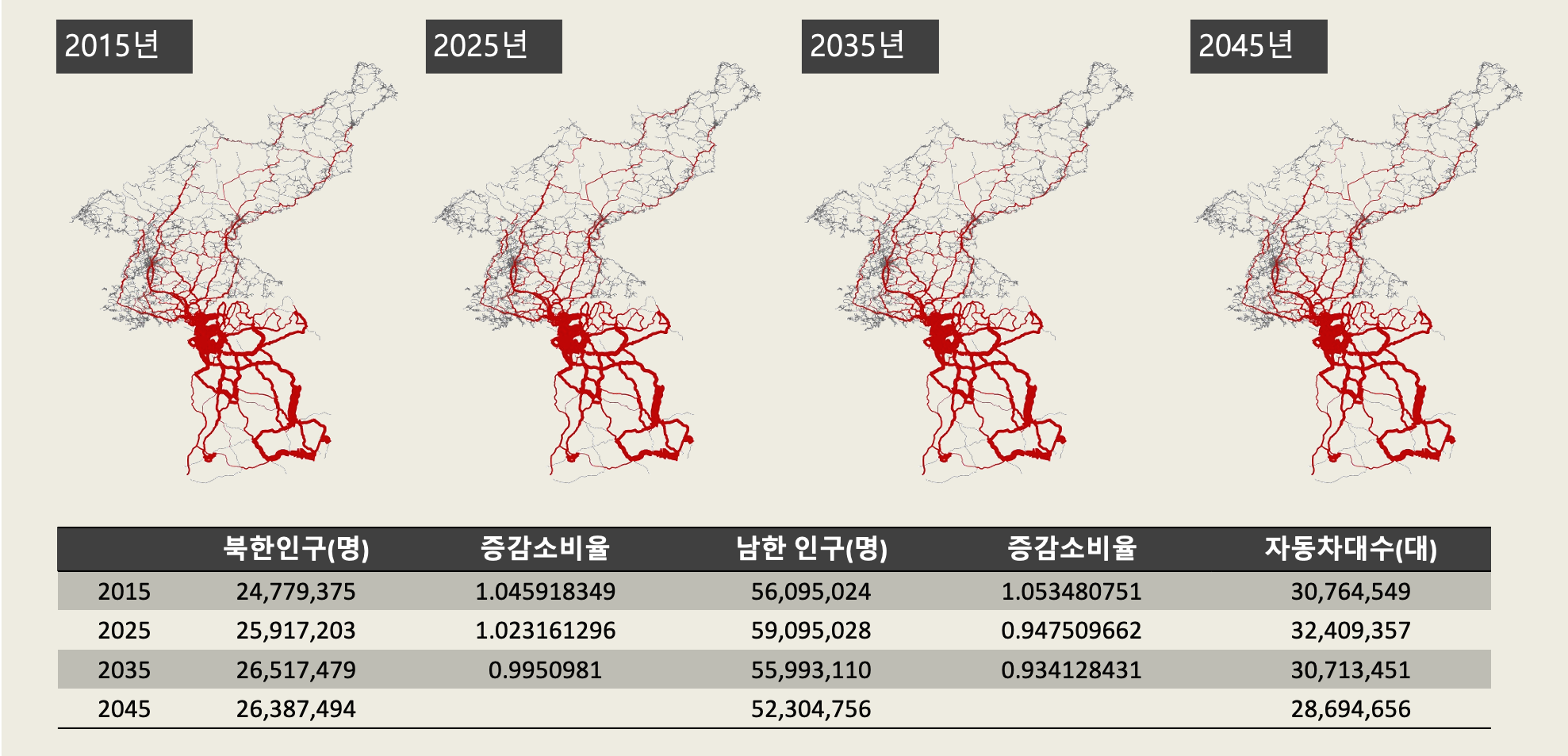 - 통일 시 도로건설에 따른 도로 적정성 분석이 가능