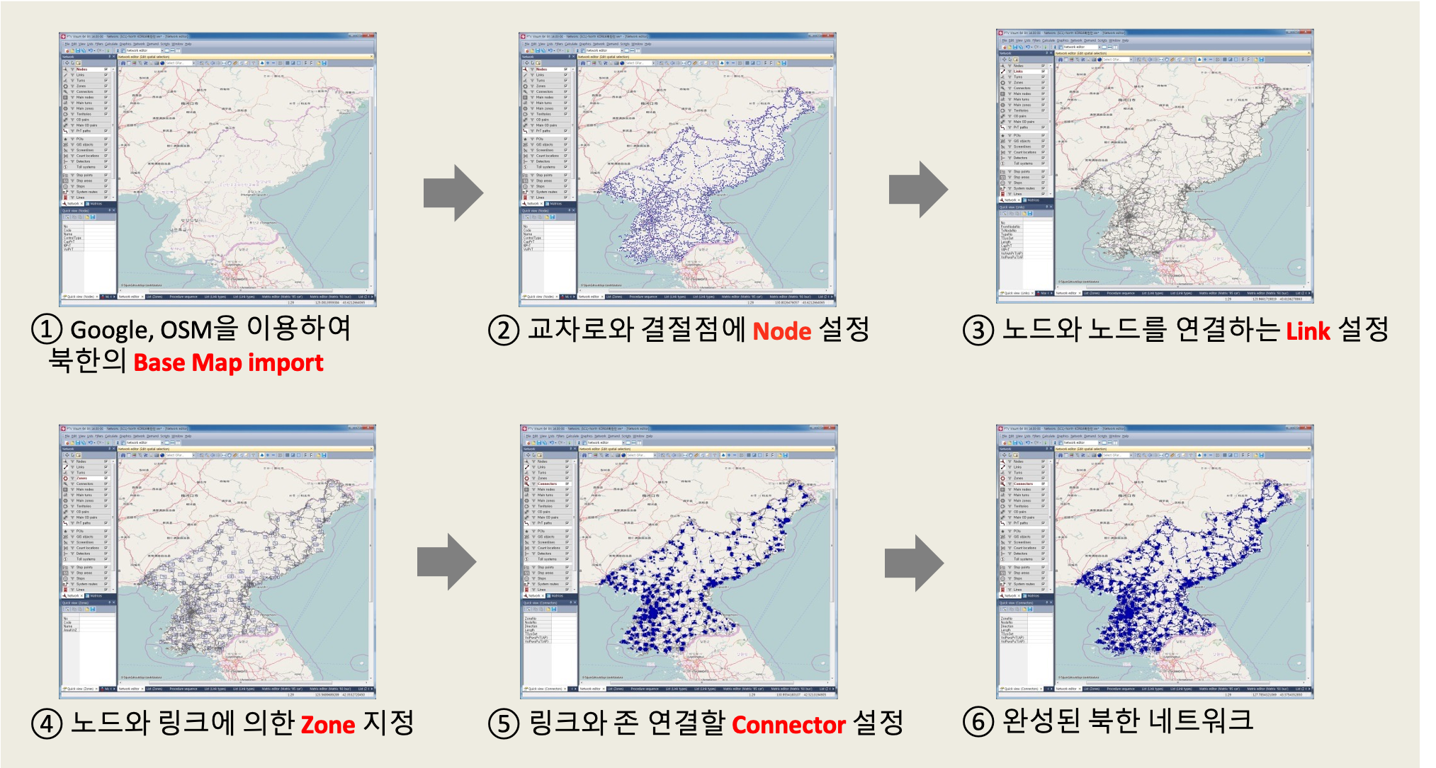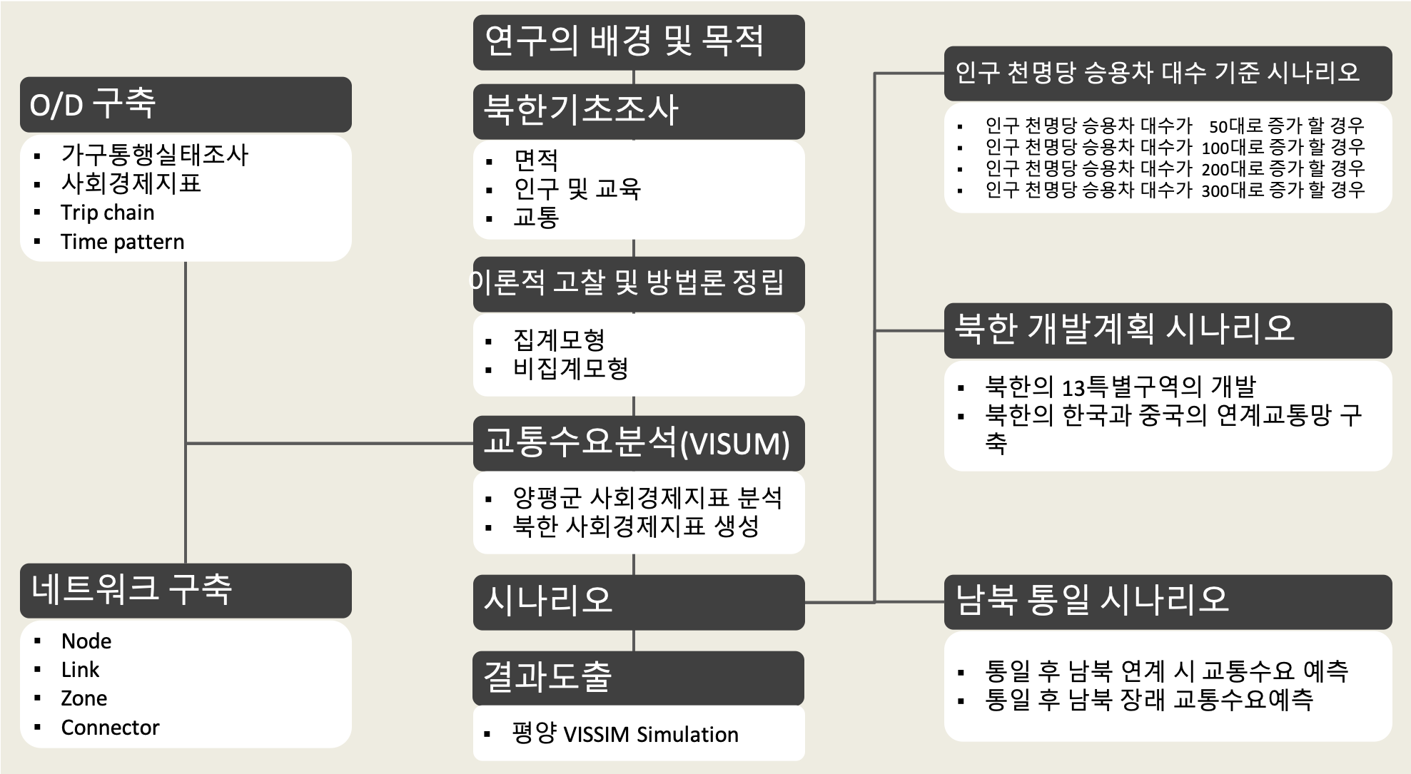 - 본 연구는 현 시점에서 활용 가능한 자료들을 바탕으로 북한 개방 시 활용 가능한 한반도 교통수요 모델을 구축하여, 장래 북한 개발 시나리오 별로 북한 교통수요를 예측할 수 있는 프로그램을 개발함