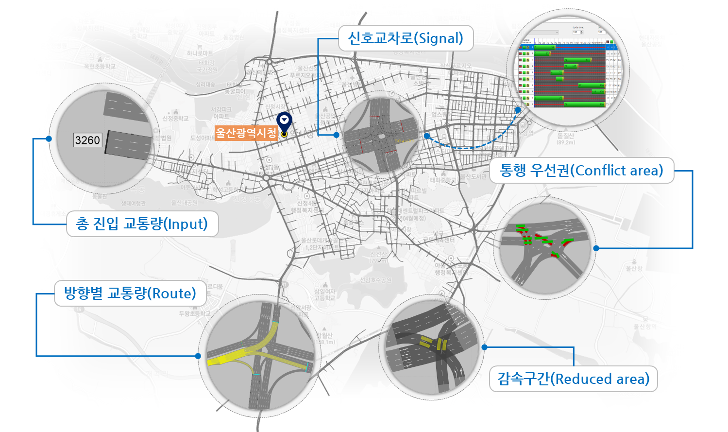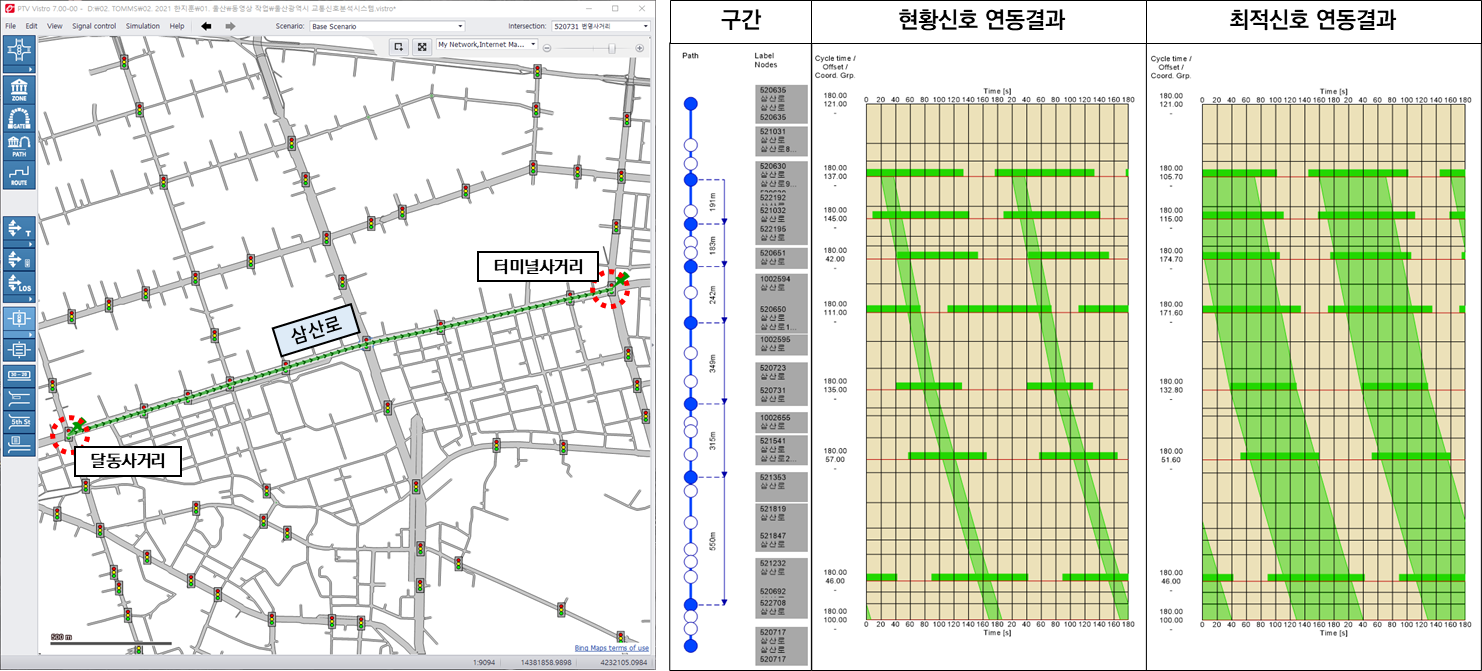 - 울산 남구를 대상으로 교차로 및 교통축을 고려한 최적신호 도출