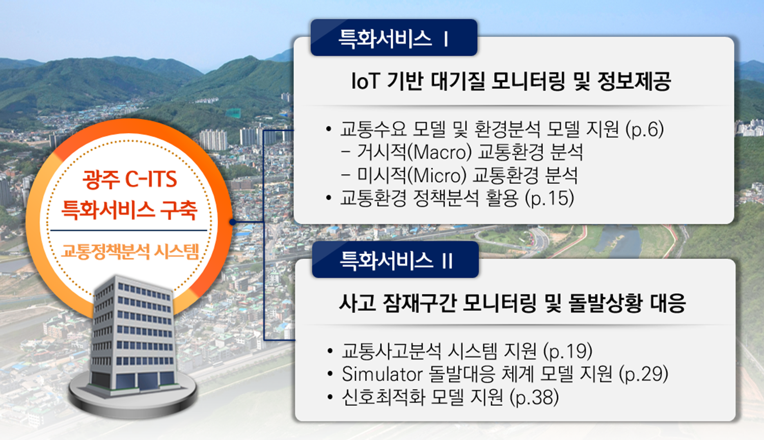 - 교통안전&인공지능&친환경 서비스를 제공하기 위해 IoT 기반 대기질 모니터링 및 정보제공, 사고 잠재구간 모니터링 및 돌발상황 대응 서비스를 제공함