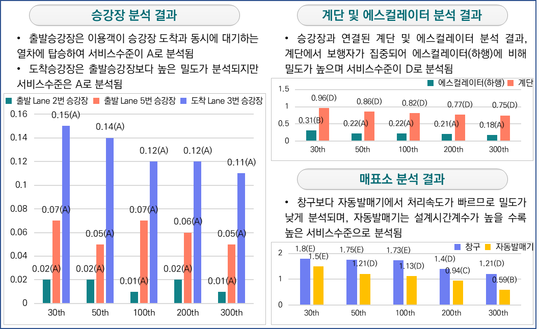 - 이러한 분석방법을 통하여 기존의 철도역사 설계지침 상의 수학적 공식 대비 다양한 대안에 대한 정량적, 정성적 분석 및 시설물 규모의 최적화 설계가 가능함