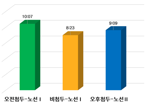 - 오전첨두 및 오후첨두 분석값 비교 시 오후첨두 노선Ⅱ의 평균지체시간이 오전 첨두 노선Ⅰ보다 58초 낮았으며, 평균통행속도는 0.05km/h 낮게 분석됨