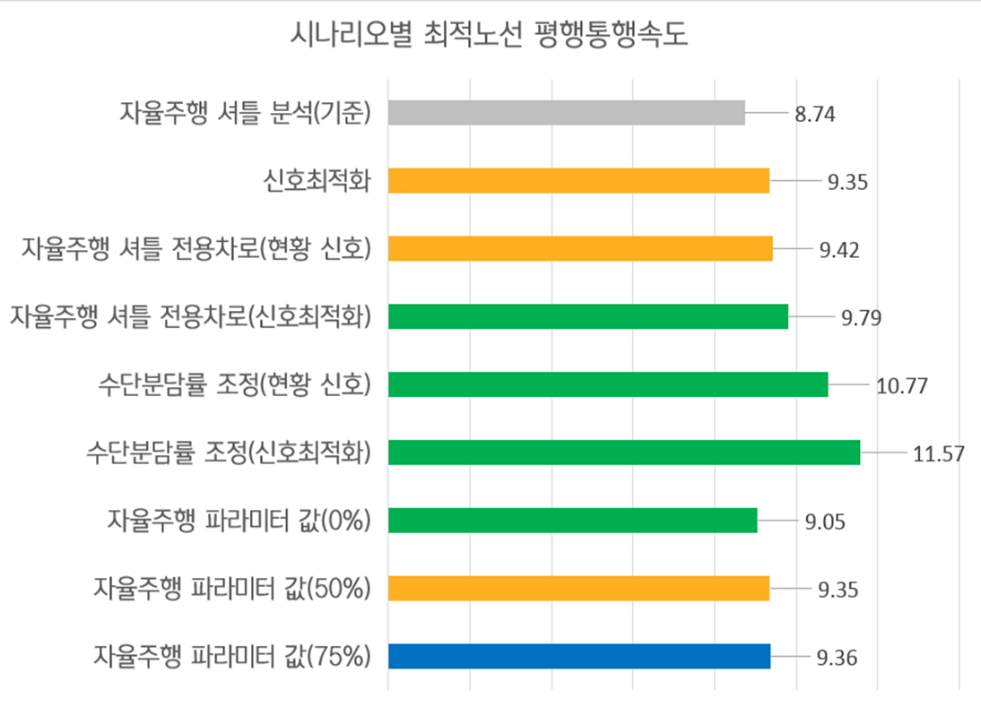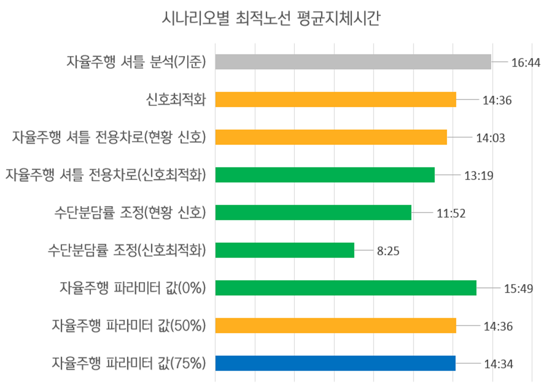 - 장래 분석대상권 각 시나리오(신호최적화, 자율주행 셔틀 전용차로, 수단분담률 조정, 자율주행 파라미터 조정)별 자율주행 셔틀운행 최적노선 분석결과 수단분담률 조정 시나리오(신호최적화) 노선 Ⅰ이 최소 지체시간 및 최고 평균통행속도로 분석됨