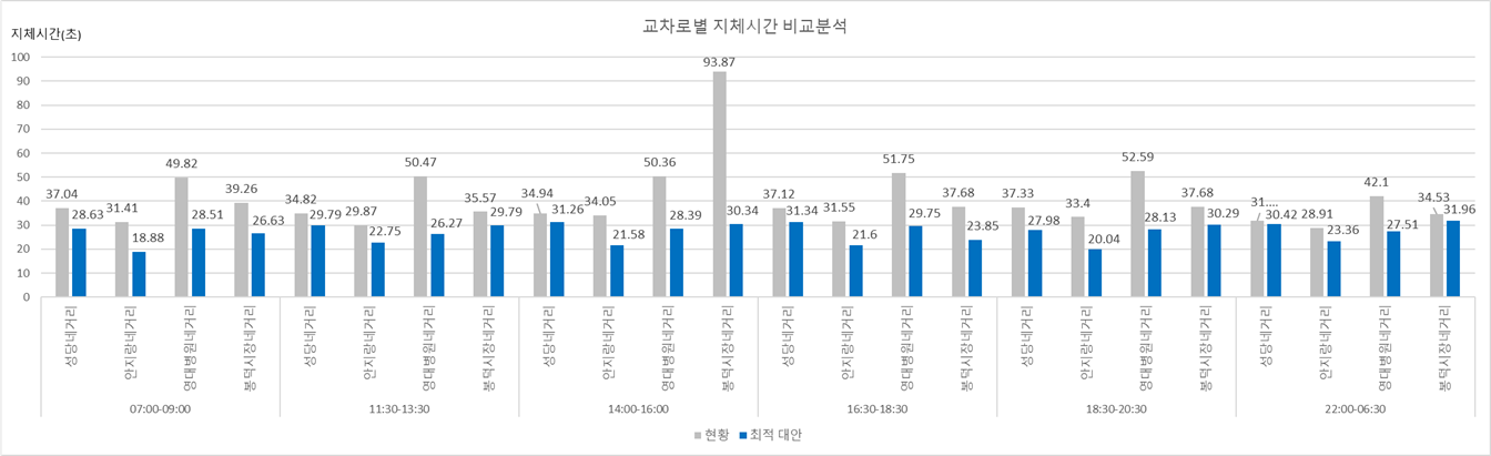 통행속도 분석 결과를 고려하여 시나리오별 분석 교차로의 지체시간을 비교분석한 결과, 현황 대비 선정한 시간대별 최적신호 시나리오 지체시간이 크게 감소함