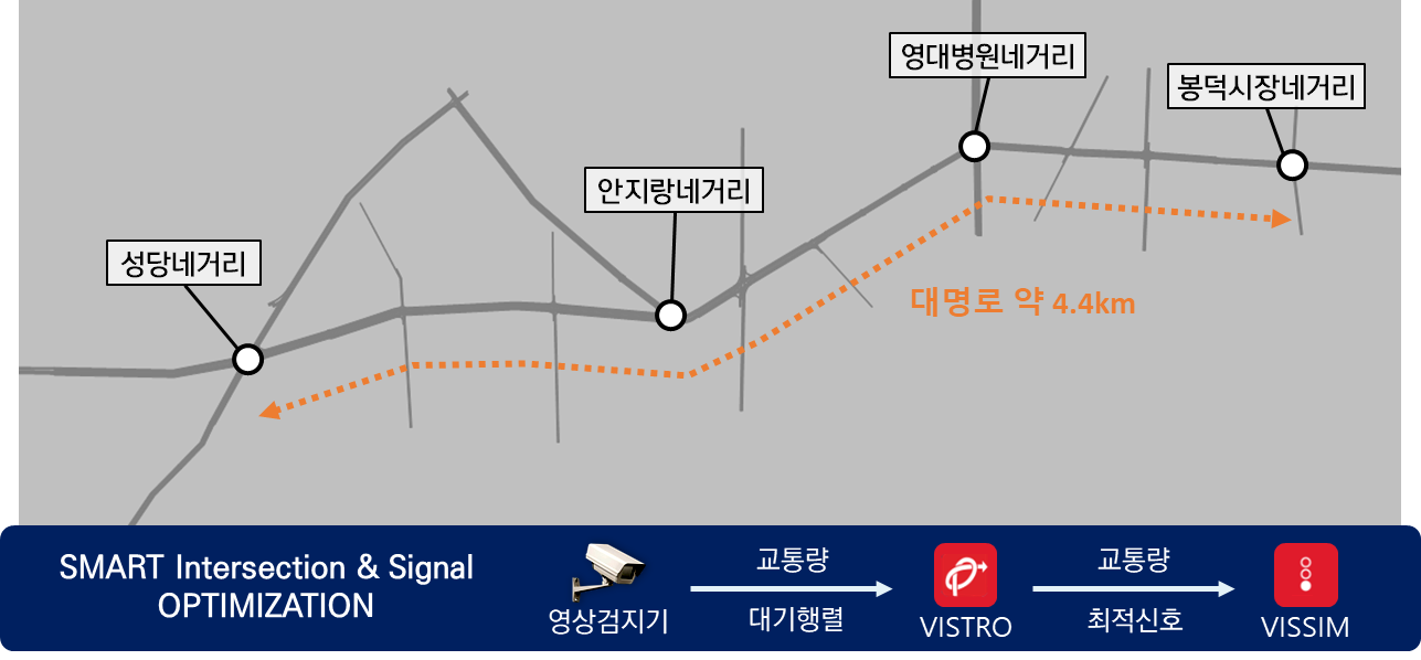 - 이를 교통흐름 전문 SW VISSIM과 연계하여 효과분석이나 개선방안을 분석하는 “최적화된 교통신호운영시스템” 을 구축함