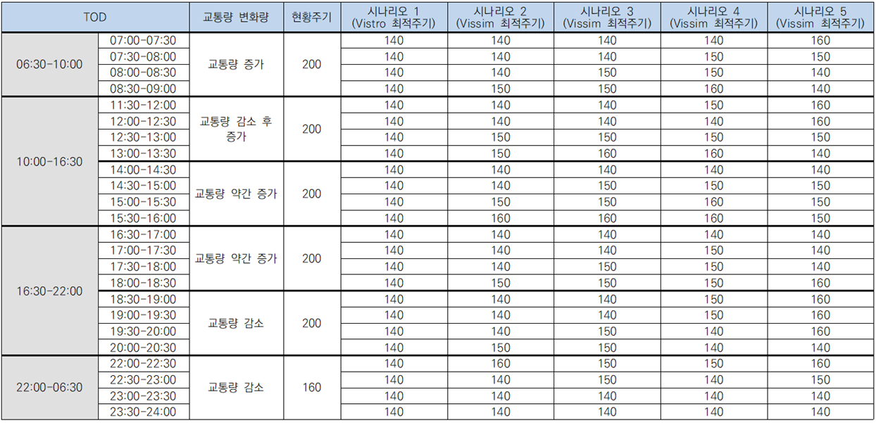- 교차로별 기하구조 및 세분화된 TOD 분석 시간대별 시나리오에 대해 30분 간격 교통량을 기반으로 개별교차로 신호최적화를 수행한 결과 녹색시간 증감으로 최적주기는 200초→140초로 분석됨