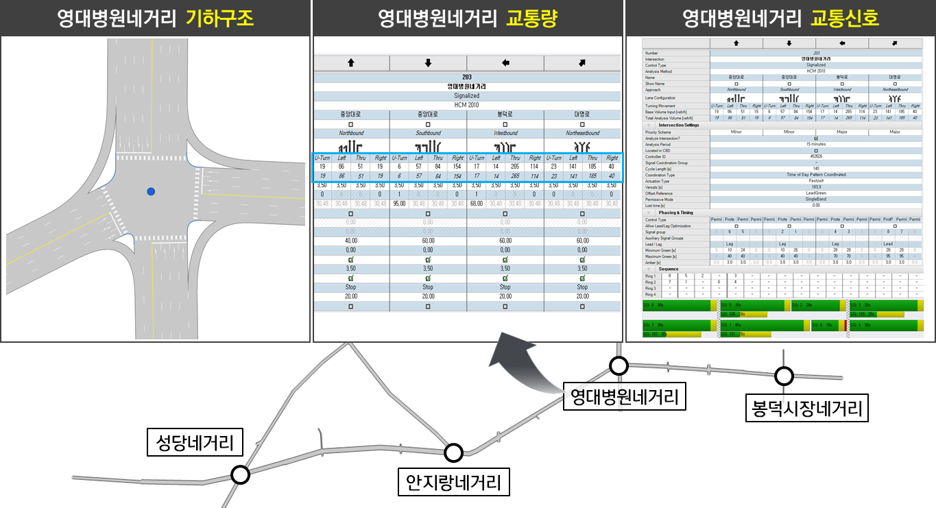 분석 대상지의 교통축 대명로를 중심으로 총 4개의 주요 교차로에 대하여 기하구조, 교통량, 교통신호 데이터를 입력하여 현황 네트워크를 구축함
