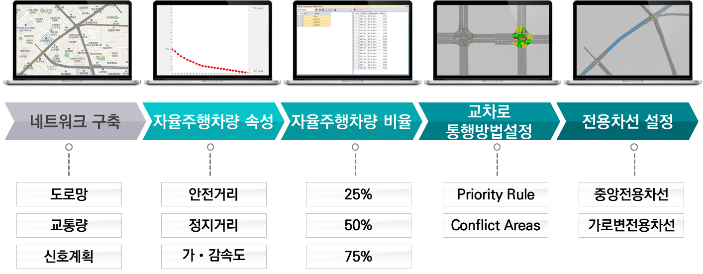 - 본 연구에서는 자율주행차량의 도입에 따라 교차로, 교통축 등 도심부 단속류에서 자율주행차량의 통행방식을 분석하고, 실제 운전자의 운전행태 반영을 통해 자율주행 도입 상황에서 일반차량의 주행안전성을 평가하는 것을 목적으로 함
