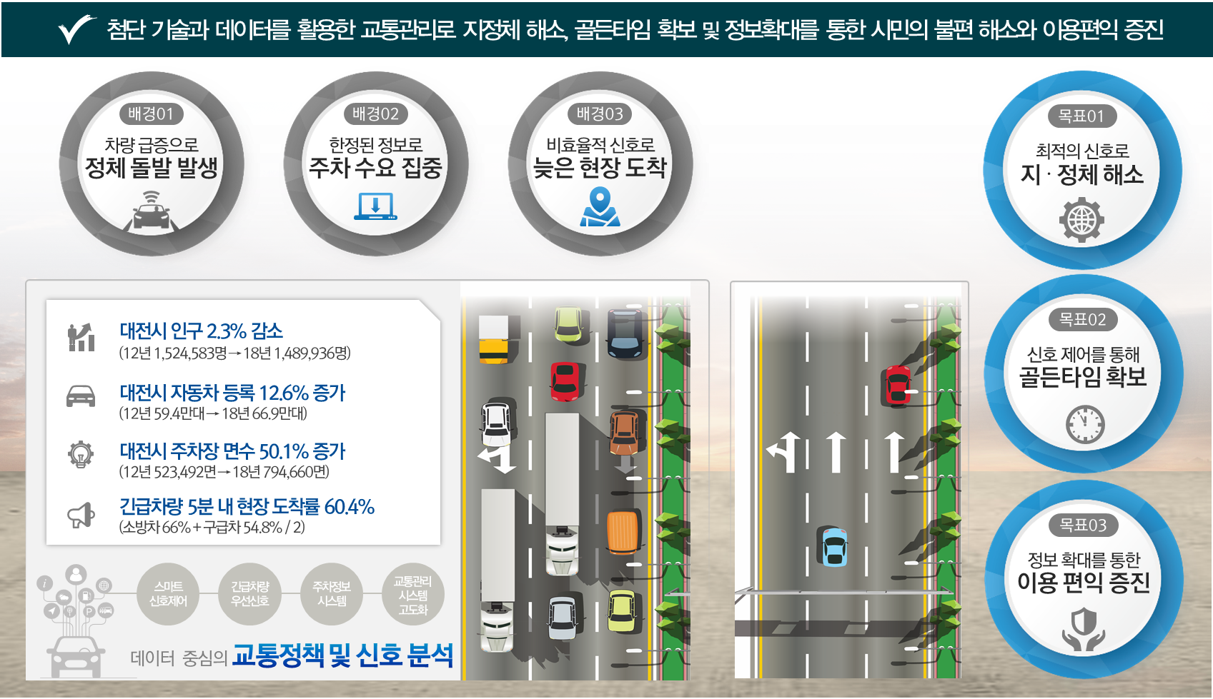 - 대전 도심부 주요구간에 정보 수집 및 제공을 위해 스마트 신호제어시스템 및 교통지원시스템 도입을 통해 돌발상황(공사, 사고, 행사, 이벤트 등)에 대한 실시간 관리/통제가 가능한 효율적인 운영방안 수립하고, 수집된 교통정보를 분석하여 교통정책에 반영하고자 함