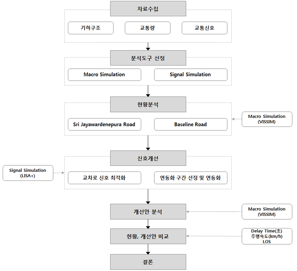- 따라서 스리랑카 콜롬보의 교통신호시스템을 개선시킬 수 있도록 주요 교차로 및 구간을 교통신호프로그램과 미시적 교통시뮬레이션 활용한 효과 분석을 통하여 신호운영 효율성을 최대화 시키고자 함
