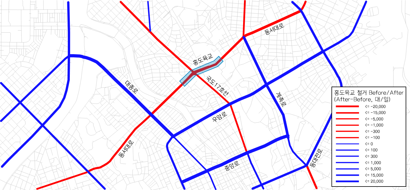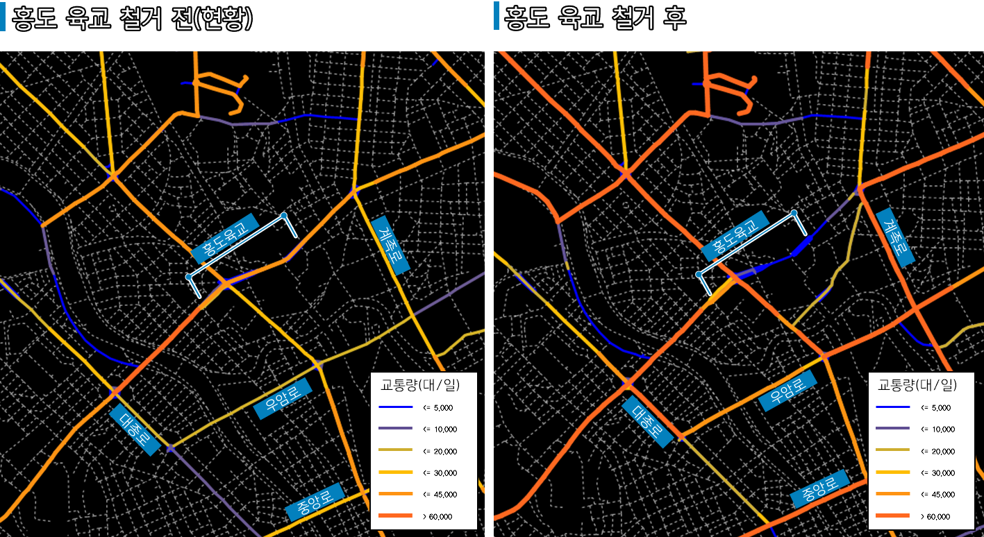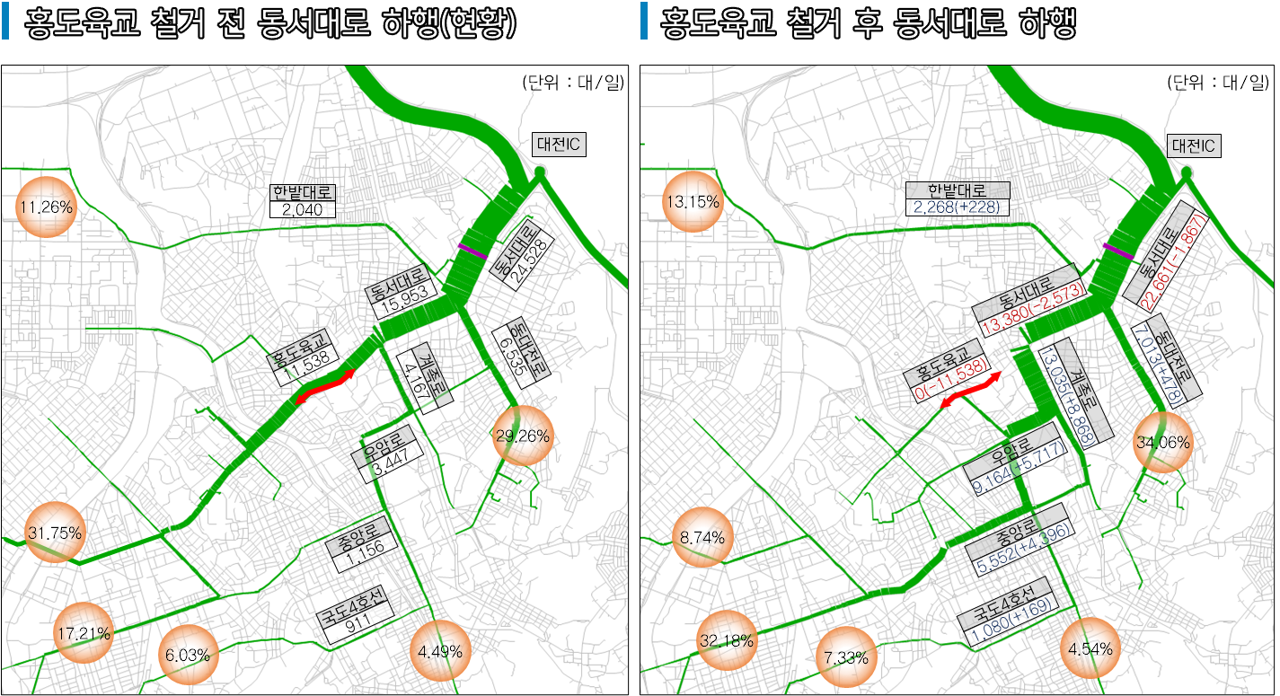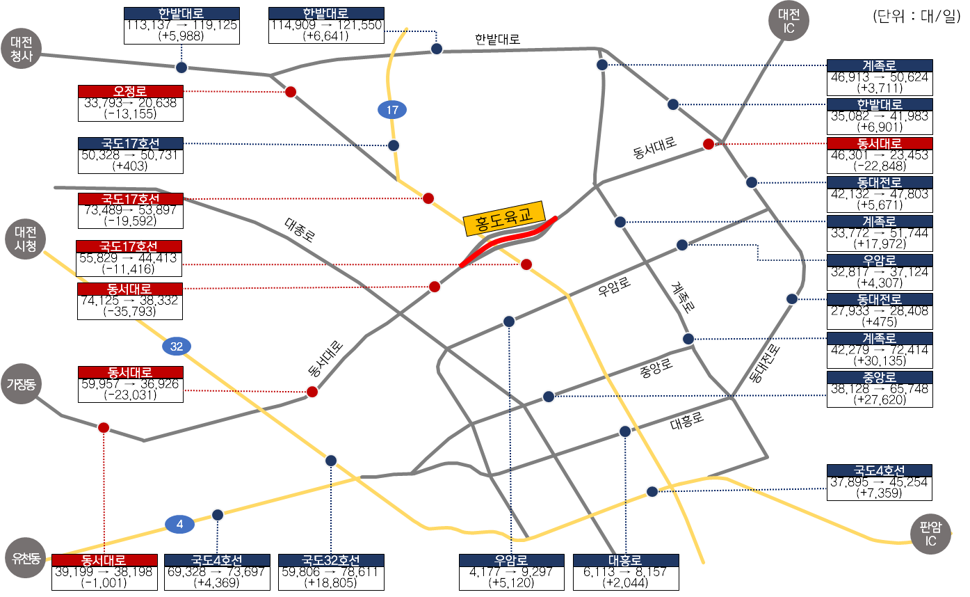 홍도육교 철거 시 기존 홍도육교를 통행하던 차량이 계족로/대종로(NS), 중앙로/우암로(EW)로 우회하여 통행량이 증가함