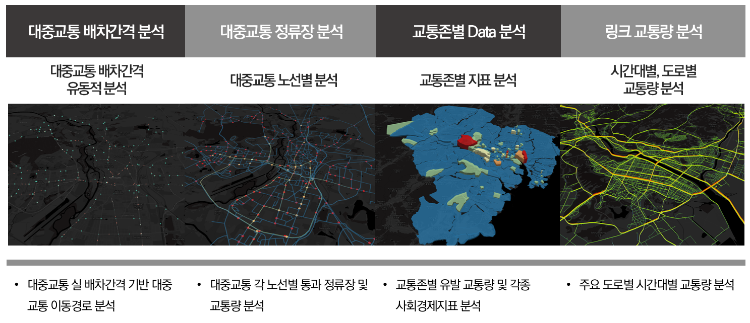- 교통수요분석 시각화에 익숙하지 않은 사용자의 경우도 DashBoard 내 링크, 행정구역별 교통수요 분석 데이터를 2D/3D 형식으로 용이하게 표출이 가능