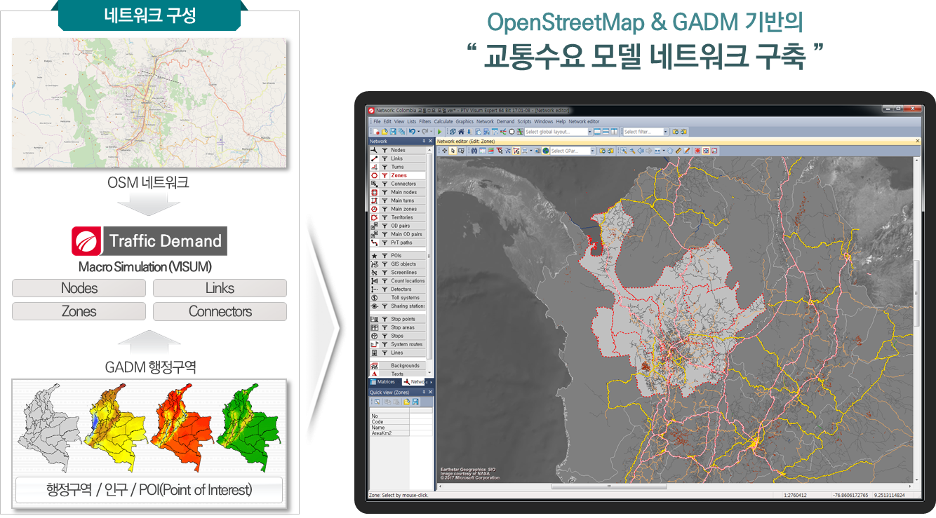 Open-source 기반 OSM(OpenStreetMap) 네트워크 및 GADM(Database of Global Administrative Areas)의 행정구역 데이터를 활용하여 메데진 시 교통수요 모델을 구축함