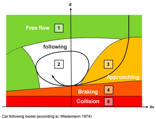 UAM의 추종모델은 도로교통의 운전자의 4개 운행행태에 기반한 Wiedemann의 교통흐름 모델을 준용