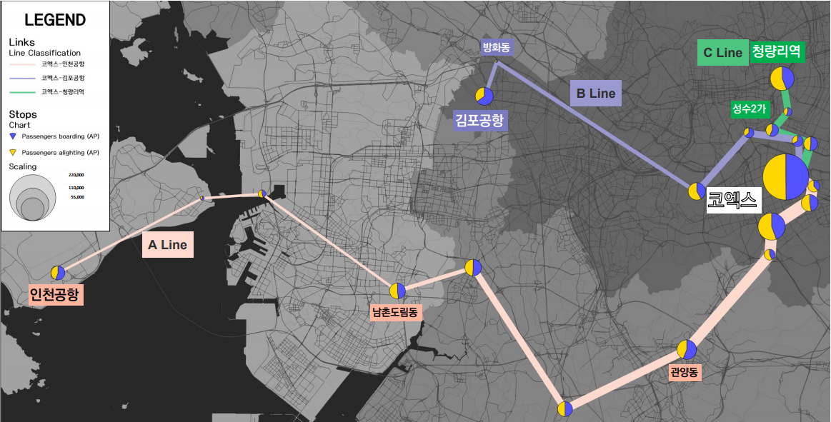 ● 모든 Verti Port-Verti Port를 Visum에서 연결하고, 일정 거리(UAM으로 통행하는 것이 합리적인 거리, 예를 들어 15Km 이상 등) 이상만 노선으로 설정, UAM 운행노선을 노선 별로 구축하고, Headway를 배정