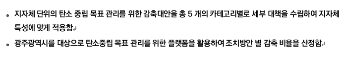 | 1 | 디젤 절감 방안 | 소프트웨어 업데이트 , 재정적 지원 | 환경친화 등급에 따른 자동차 배기량 조정을 통한 환경변화 효과분석 |