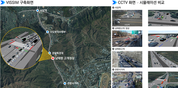 - 과천 남태령고개 정상 버스전용차로의 소통개선을 위하여 신호운영체계(버스전용신호 도입 등)의 대안별 평가를 위해 Micro Simulation 모형 VISSIM을 활용함