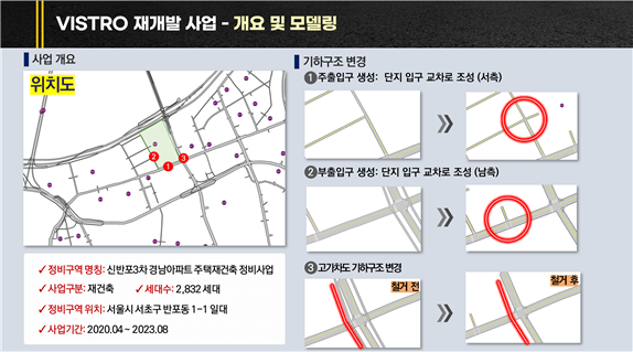 - 서초구 신반포 3차 경남아파트(現 래미안원베일리아파트) 재건축사업 시 발생가능한 기하구조 변경에 따른 주요교차로(강남터미널 고가 밑 교차로, 신반포역 교차로) 효과분석을 시행함