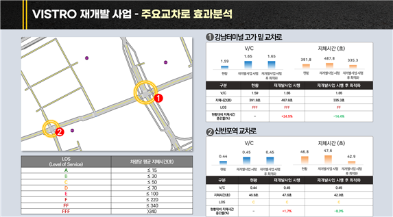 재개발사업 대상지인 강남터미널 고가 밑 교차로와 신반포역 교차로의 교통 현황 분석 결과, 재개발 시행 시 지체시간과 V/C(교통량 대비 용량 비율)가 증가할 것으로 분석함