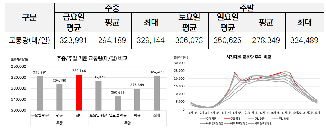 - 교통량 분석 결과, 주중은 금요일, 주말은 토요일 교통량이