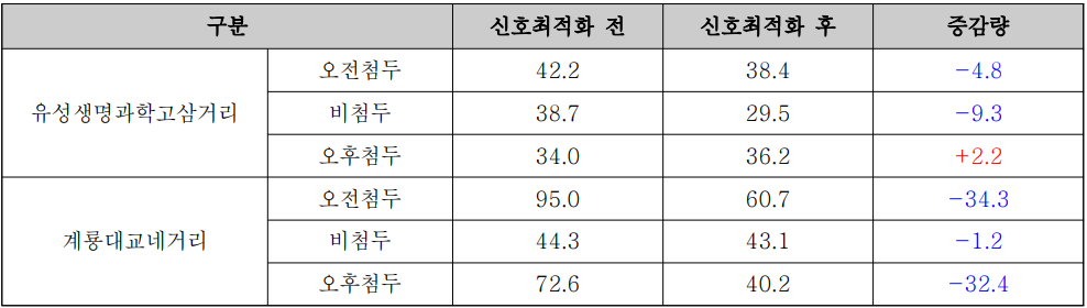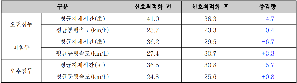 - 신호최적화를 통해 차량 대기 시간 단축으로 정체를 최소화하여 원활한 교통흐름을 기대할 수 있으며 특정 시간대의 교통량에 맞춰 신호를 조정함으로써 교차로 혼잡을 완화하고 , 전체적인 교통 혼잡도를 개선할 수 있을 것으로 판단됨