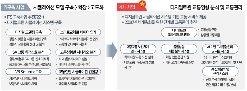 - 강릉 ITS 사업을 시작으로 시스템 기반 구축, 디지털트윈 분석, 신호체계 분석 시스템 고도화 사업을 추진함