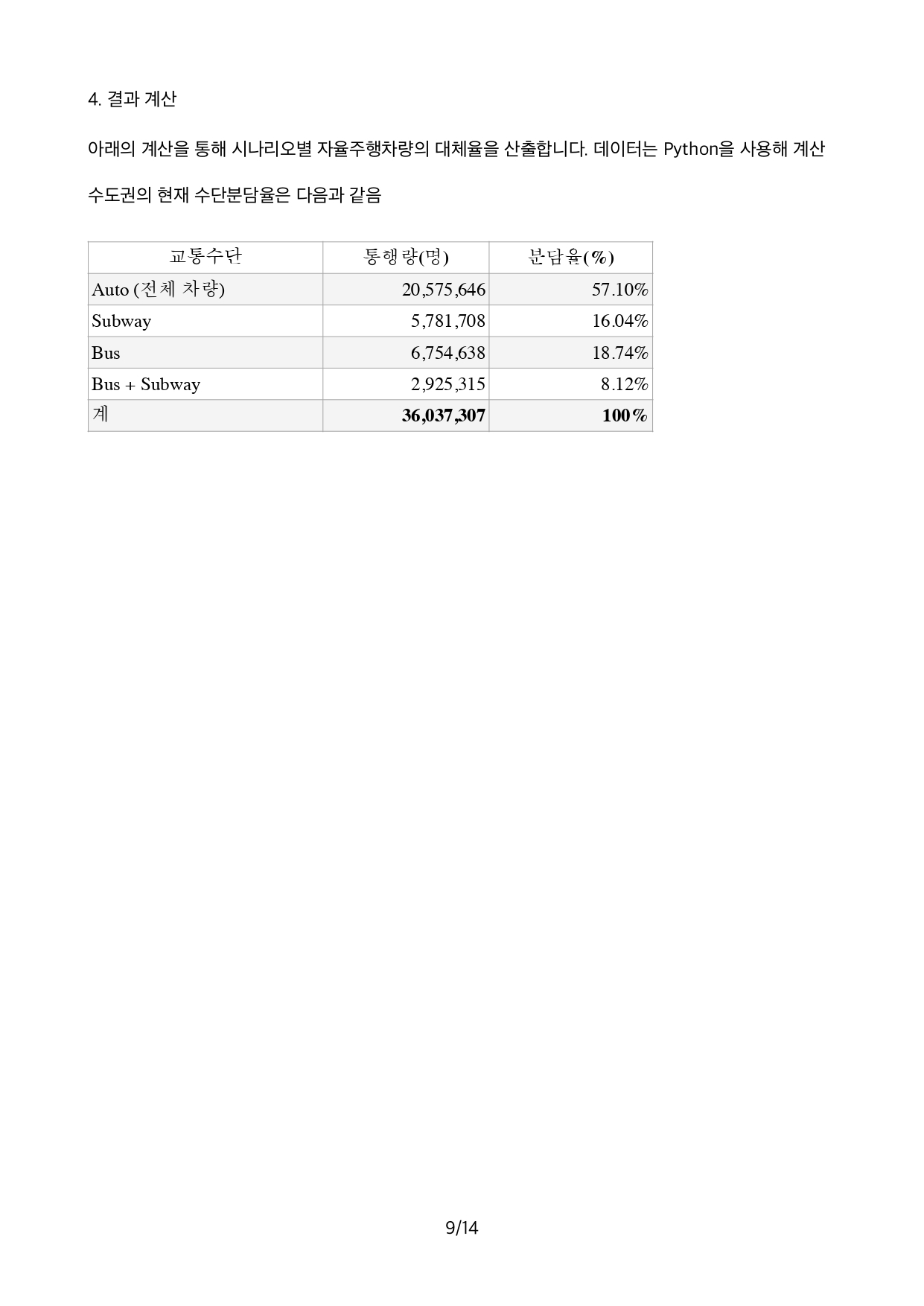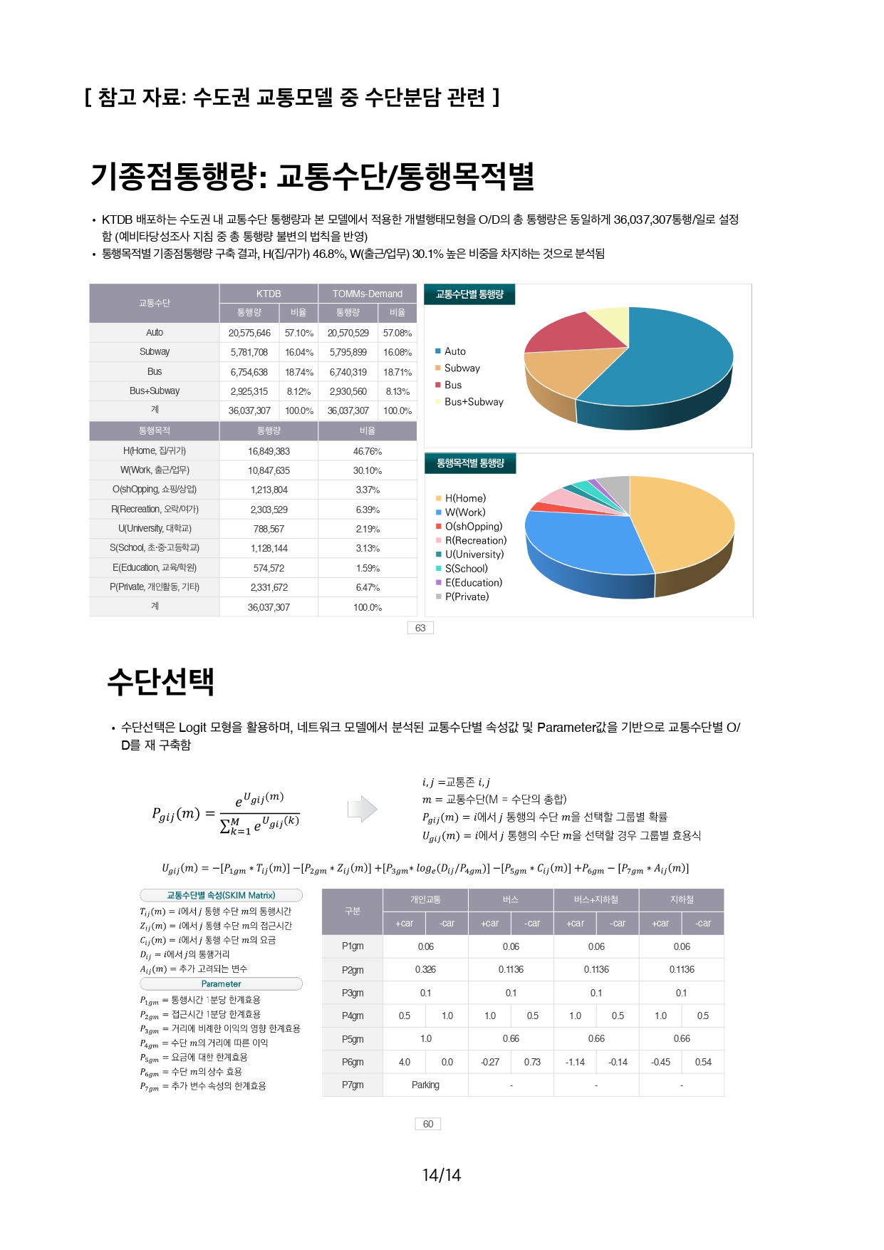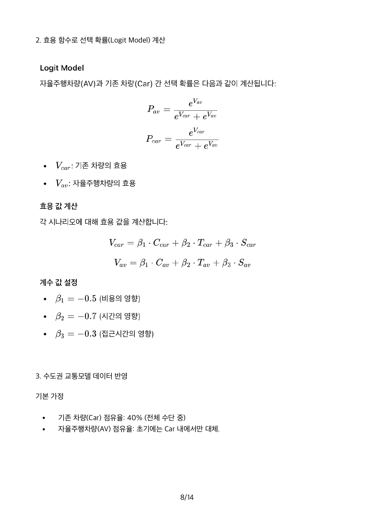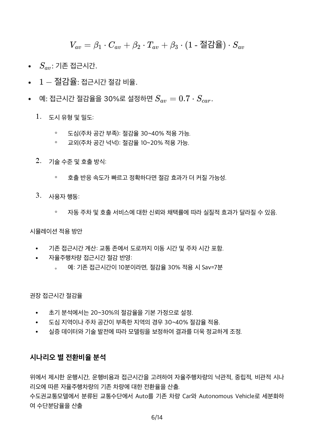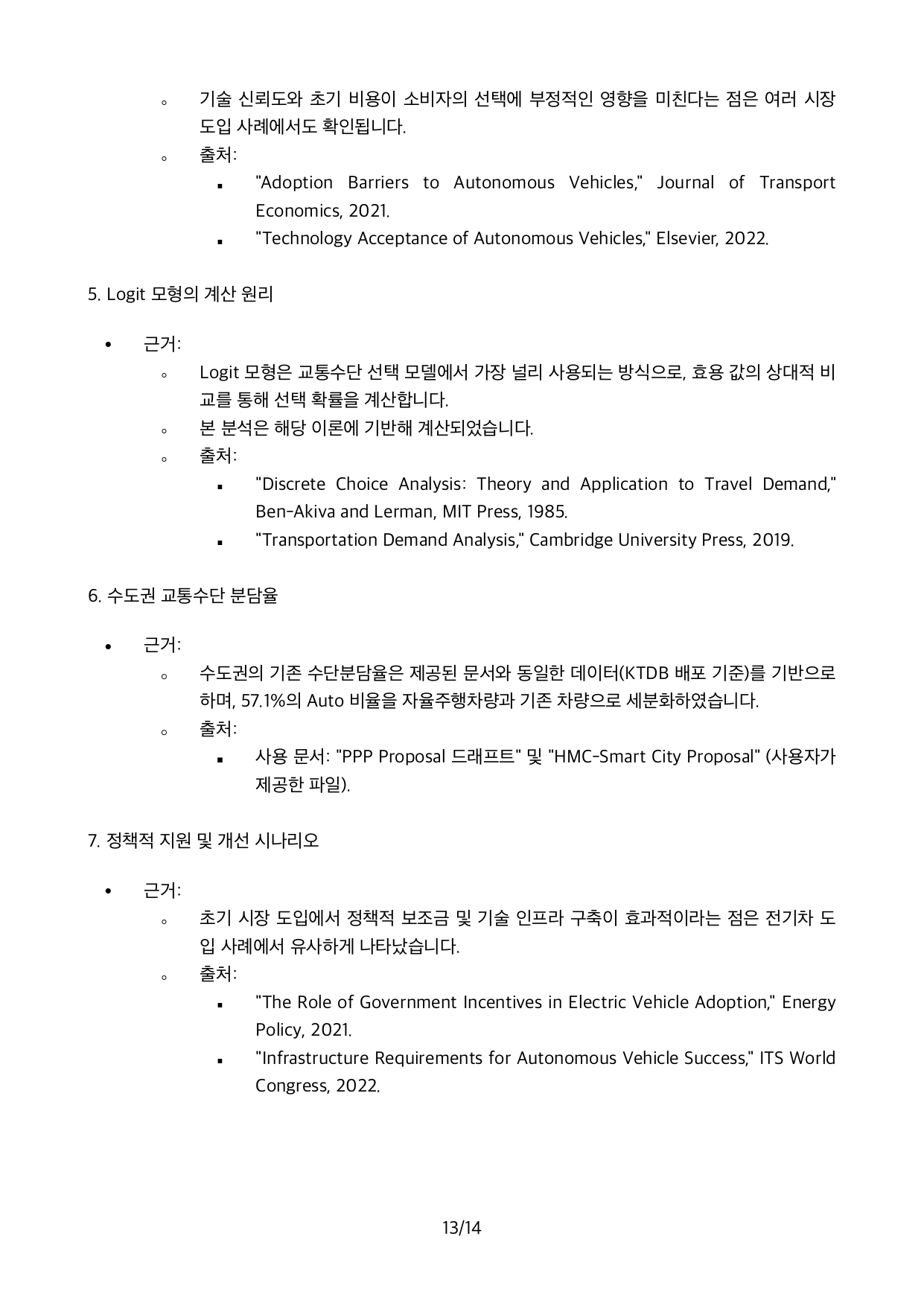 교통수단 분담 모델(로짓, 효용함수)의 변수인 차량 운행시간, 운행비용, 접근시간 등에 대한 AV 차량특성을 TOMMs의 기 구축한 수도권 교통수요모델에 반영한 결과, Car로 부터 AV로 전환되는 비율이 13%로 예측되었습니다.