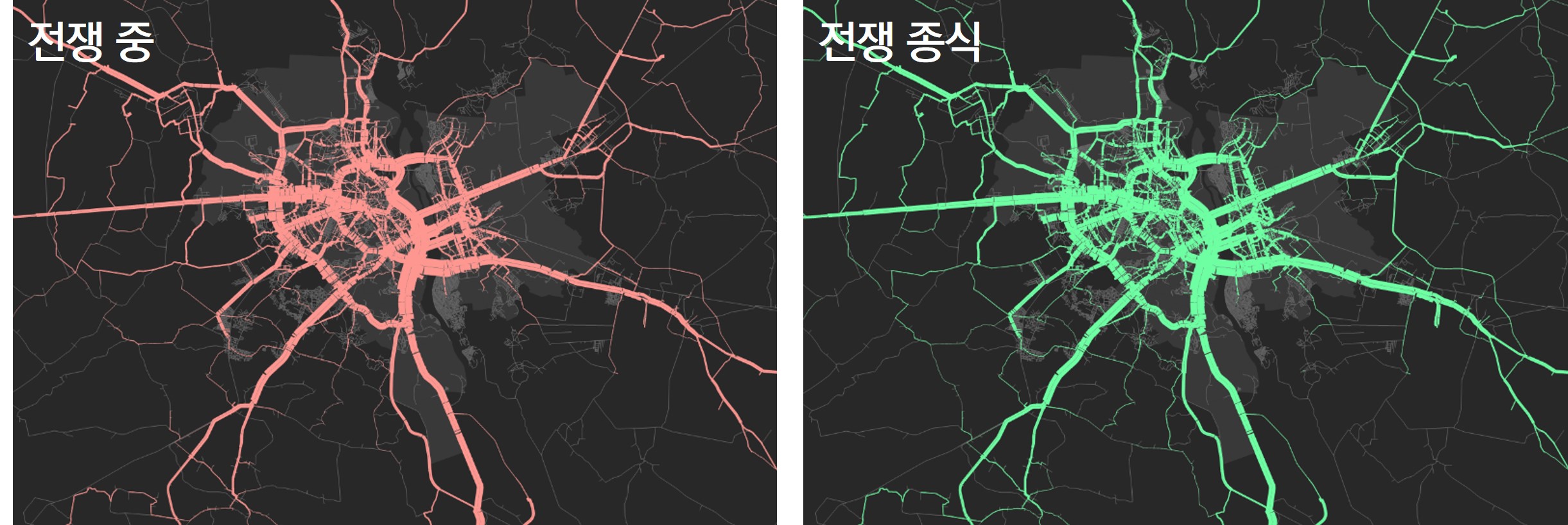 - 우크라이나의 전쟁으로 다양한 시나리오(전쟁 전, 전쟁 발발, 전쟁 종식 등)를 네트워크에 반영하여 교통 파급효과를 분석함