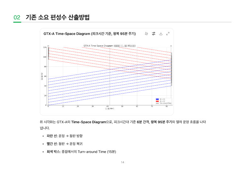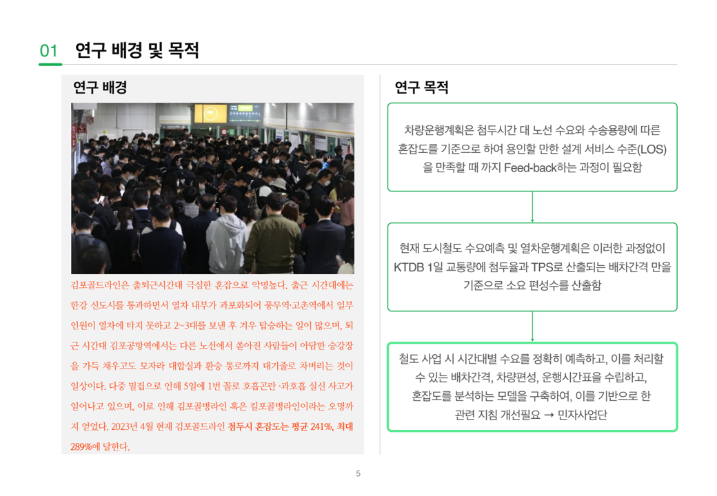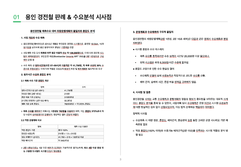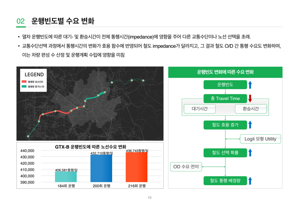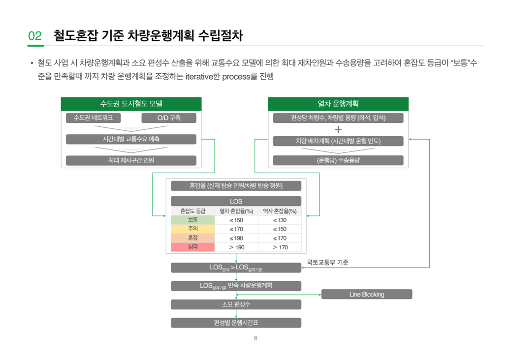 - 이를 위해 운행계획·수요분석·혼잡도 평가가 통합된 모델을 구축하고, 민자사업 지침 개선으로 이어질 필요