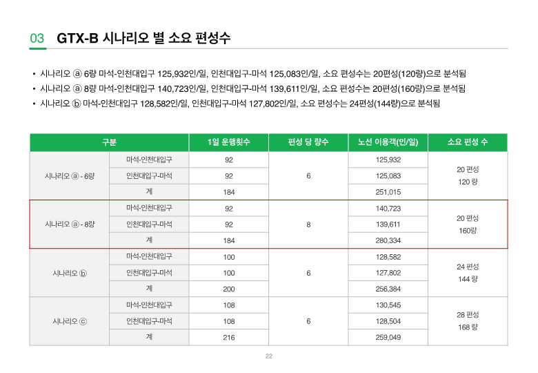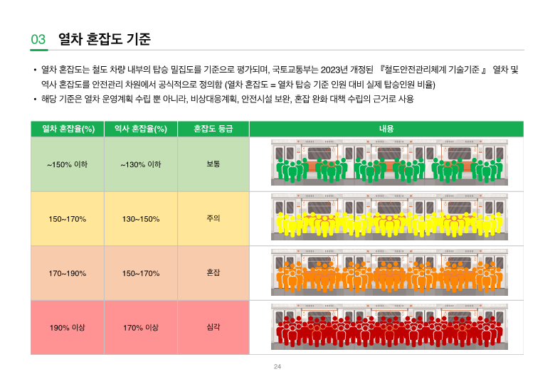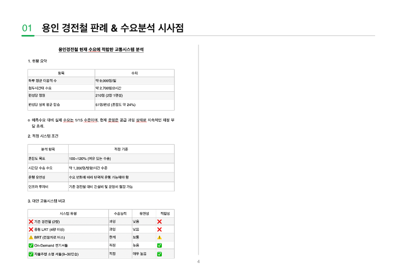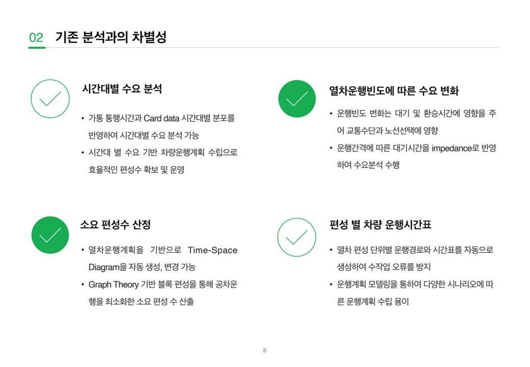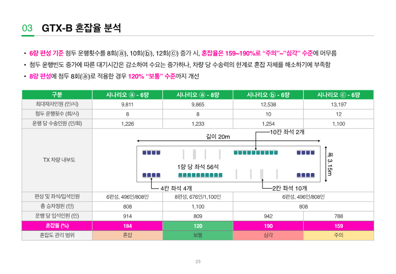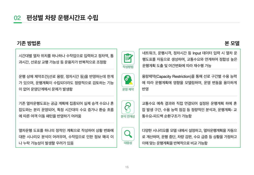 - 이를 위해 운행계획·수요분석·혼잡도 평가가 통합된 모델을 구축하고, 민자사업 지침 개선으로 이어질 필요