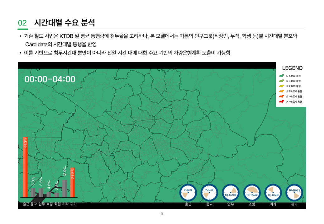 - 시간대별 수요 예측을 바탕으로 이를 처리할 수 있는 배차간격, 차량편성, 운행시간표를 설계하고 혼잡도 분석