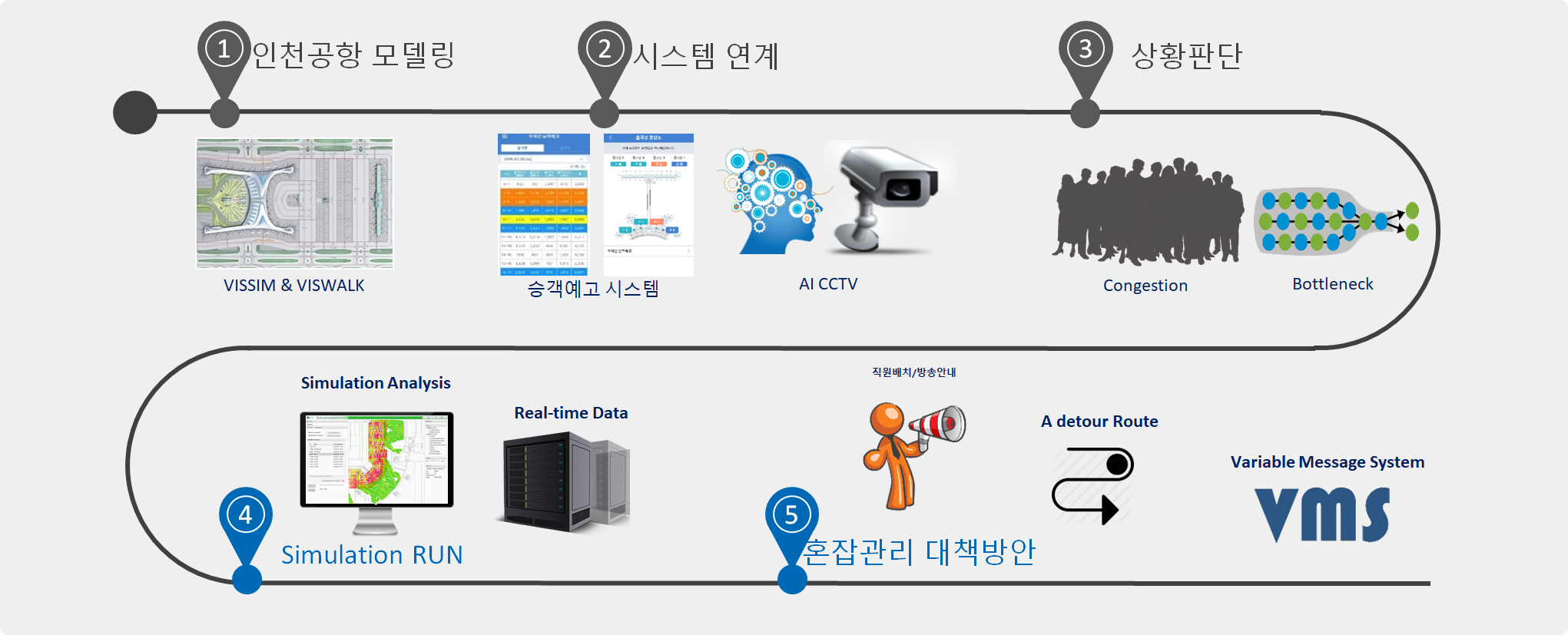 본 시스템은 인천공항청사 교통(外) 및 보행자(內) 시뮬레이션 구축(Step1) 후 테러, 교통 및 이용객 혼잡 발생 시 대응방안을 위한 Simulation 기반 실시간 데이터와 연계(Step2)하여 체계적인 통합 교통&보행자 관리시스템임