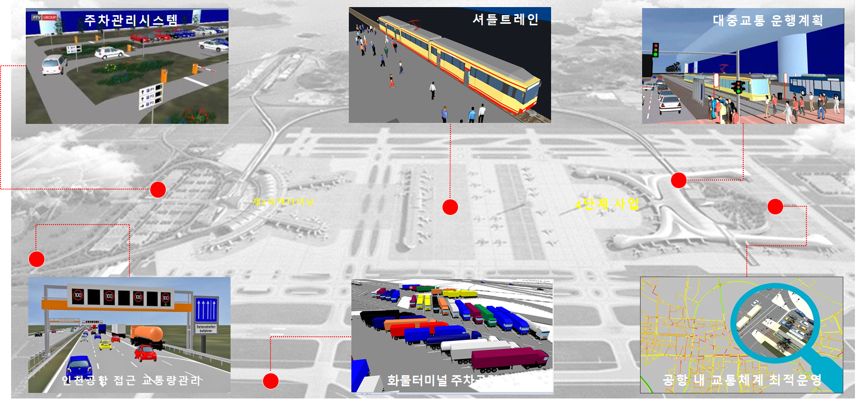 4단계 사업 건설에 따른 항공수요 급증으로 인천공항의 교통패턴(교통혼잡, 대중교통 운행계획, 주•정차 관리)이 상당히 변하게 될 것으로 예측되어 이에 대비한 인천공항 활주로부터 교통센터까지 모든 교통수단과 교통망이 포함된 Integrated Traffic Management System을 구축함