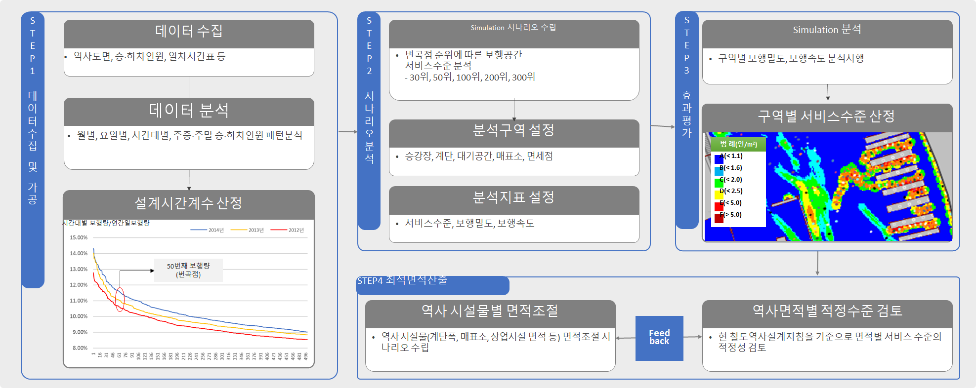 4단계 사업 설계 시 항공 설계수요에 따른 시설용도별 동선과 보행량에 따른 용도별 최적 규모 및 배치, 동선 계획에 대하여 사전에 Simulation 하여 최적의 공항설계를 유도하며, (최근 대규모 철도역사 설계 등 추세임)