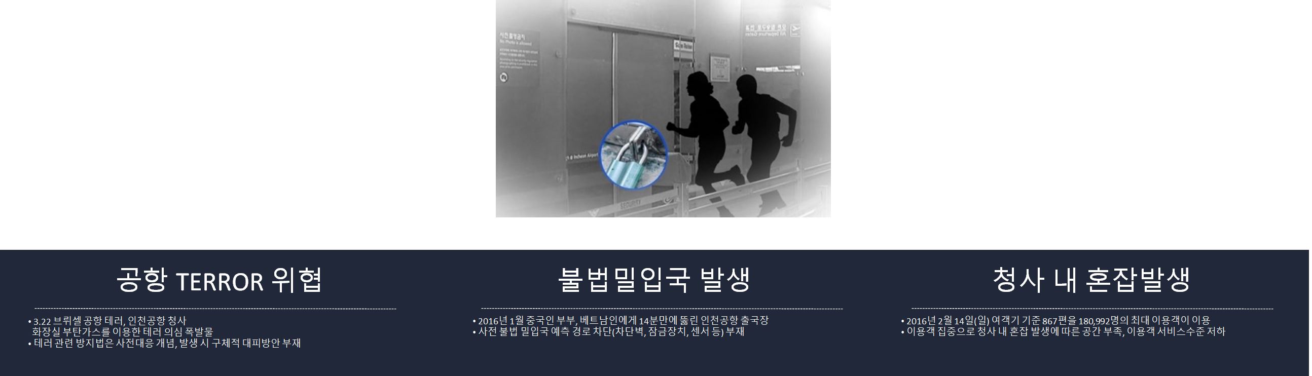 동북아시아 Hub-Port로서의 인천국제공항은 2002년 개항이래 공항 서비스 품질평가 세계 1위를 유지 및 ACI 기준 대형공항으로 위상 공고화하고 있으나 최근의 테러 위협, 불법 밀입국, 청사 내 혼잡 등 다양한 문제에 봉착 하고 있으며, 이를 Manual 차원이 아닌 System차원의 대응방안 구축이 필요함