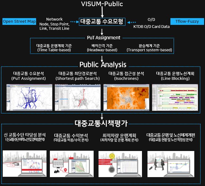 - VISUM-Public은 수요분석 프로그램인 OSM을 이용해 네트워크 모델링 및 차량수요 최적화 가능
